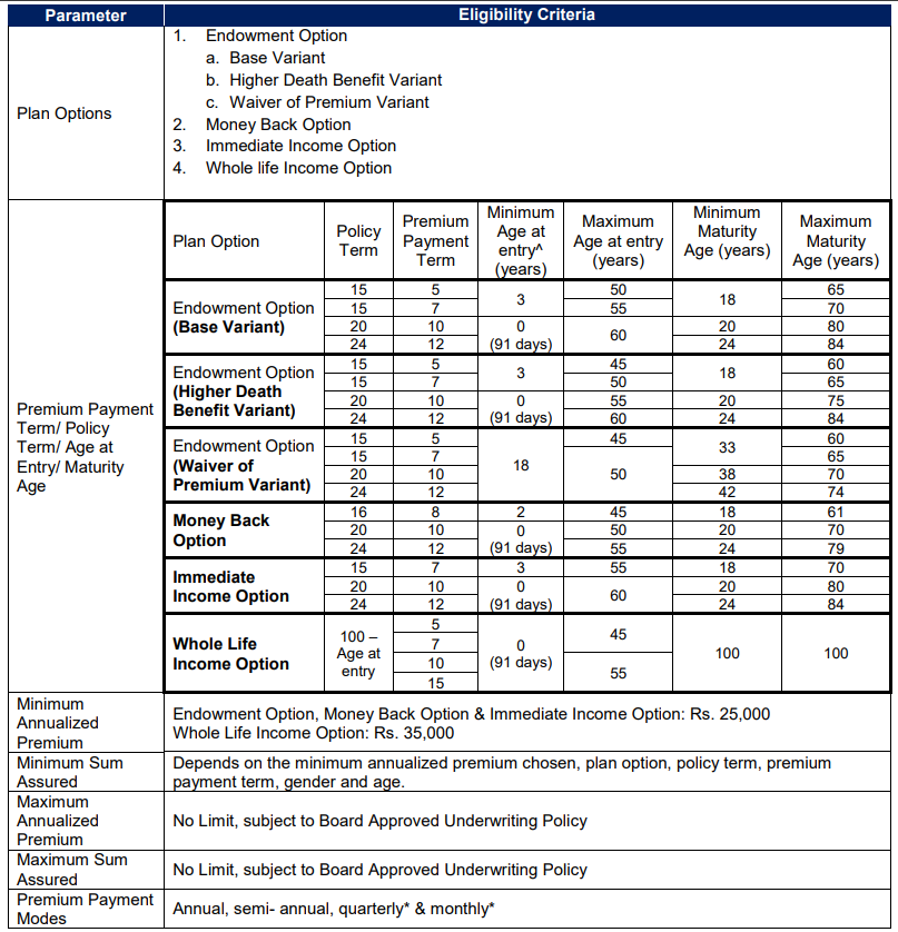 - Multiple plan variants to align with your financial objectives: Moneyback, Immediate Income, Whole Life Income, and Endowment options