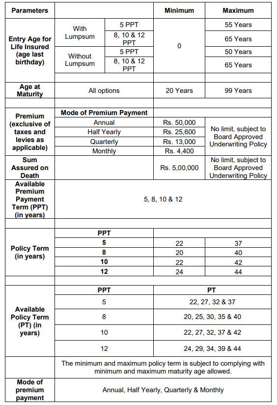 - Offers flexibility to customise the plan through multiple policy term and premium payment term options, along with a maturity benefit.