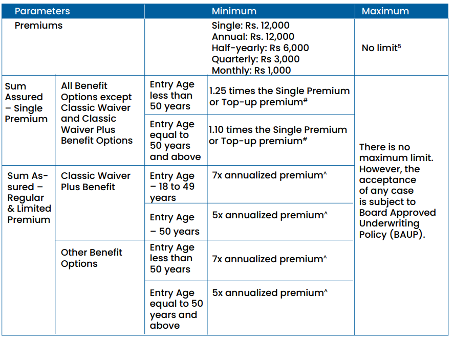 | Classic Waiver Benefit | Sum Assured PLUS Waiver of the amount equal to the modal premiums |