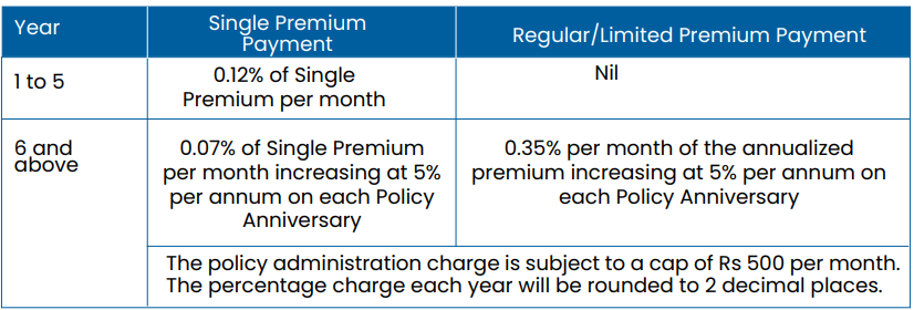 This charge will be subject to the maximum cap as allowed by IRDAI, 1.35% p.a. of the fund value, charged daily. 0.50% p.a. for Discontinued Policy Fund.