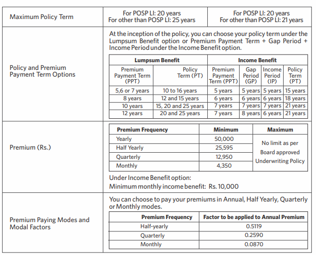 | Maximum Sum Assured on Death (Rs.) | For POSP LI: 10,00,000 | |