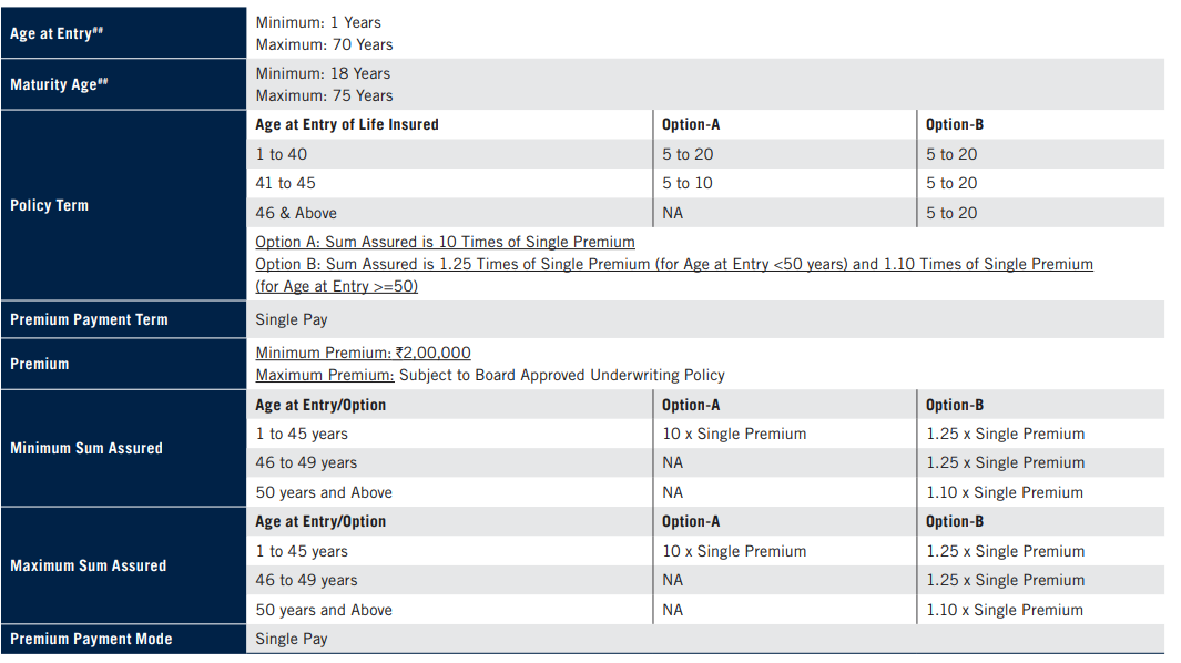 Consider a 30-year-old male who purchases the plan with a 20-year policy term and pays a single premium of ₹5,00,000. The sum assured is ₹6,25,000 (1.25× the premium).