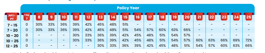 | PPT/Policy year | 1 | 2 | 3 | 4 | 5 | 6 | 7 | 8 | 9 | 10 | 11 | 12 | 13 to PT |