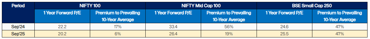 - NIFTY 100: Forward P/E has eased from 22.2x to 20.2x, premium down from 17% to 6% versus its 10-year average.